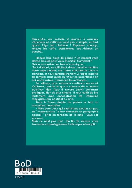 Reprendre une activité et pouvoir à nouveau s'épanouir et s'affirmer n'est pas si simple, surtout quand l'âge fait obstacle ! Reprenez courage, relevez les défis, transformez vos échecs en succès, sortez enfin de la routine quotidienne et avancez dans la vie, fier.e de vos initiatives et de vos combats. Soyez la personne que vous avez toujours voulu être, retrouvez l'énergie, la persévérance, la volonté, la résolution de vous dégager d'une période difficile... Trouvez un emploi adapté à vos ambitions et possibilités... Besoin d'un coup de pouce ? Ce manuel vous donne les clés pour vous en sortir ! Comment ? Grâce au soutien des Forces cosmiques... Tout d'abord, en sollicitant d'une certaine manière votre ange gardien, ses frères spécialistes dans le domaine, et tout particulièrement 3 Anges experts de l'emploi, mais aussi du retour de la confiance en soi (entre autres...)Sans oublier le pouvoir incontestable des archanges et esprits de la nature que vous invoquerez pour votre épanouissement professionnel. De même, (s'ils font partie de votre religion) de faire appel aux saints qui correspondent à votre souhait, et qui vous aideront à sortir d'une mauvaise période...Par ailleurs, pour retrouver confiance en soi et s'affirmer, rien de tel que le « pouvoir de la pensée positive » mais faut-il encore savoir comment pratiquer. Rien de plus simple ! Il vous suffit de lire lentement avec concentration les « formules magiques » que contient ce livre. Ce sont des phrases de suggestion mentale qui ont une puissance réelle sur votre psychisme. Qui vous aideront à développer votre enthousiasme et votre détermination pour convaincre un employeur... Dans la forme simple, les prières se font en neuvaines mensuelles.- Mais pour ceux qui souhaitent ajouter un peu de " magie lunaire " à leur demande, un paragraphe spécial " prier en fonction de la lune " vous est proposé. Il suffit de vous munir d'un calendrier de l'année en cours (et/ou à venir) avec les lunes indiquées, et de vous référer au " calendrier exemple" qui est ajouté.Rien de compliqué ! Tout vous est expliqué.Mais ce n'est pas tout ! En fin de volume, vous trouverez un pentagramme à découper et à remplir... (Bien respecter le jour de la semaine). Alors n'attendez plus, (re)trouvez l'enthousiasme et la fierté d'avoir à nouveau une activité professionnelle.Des rituels simples mais efficaces, si vous les pratiquez avec Foi et ferveur.