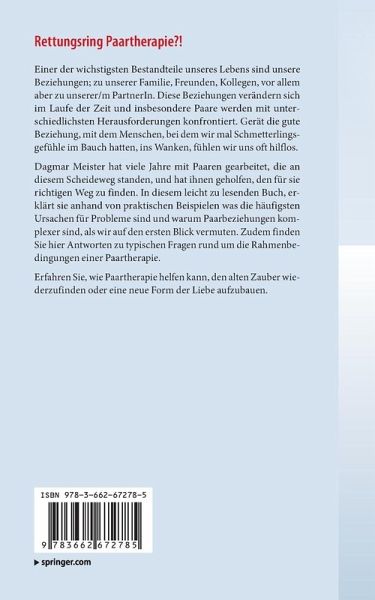 Dagmar Meister hat viele Jahre mit Paaren gearbeitet, die an diesem Scheideweg standen, und hat ihnen geholfen, den für sie richtigen Weg zu finden. In diesem leicht zu lesenden Buch, erklärt sie anhand von praktischen Beispielen was die häufigsten Ursachen für Probleme sind und warum Paarbeziehungen komplexer sind, als wir auf den ersten Blick vermuten. Zudem finden Sie hier Antworten zu typischen Fragen rund um die Rahmenbedingungen einer Paartherapie.