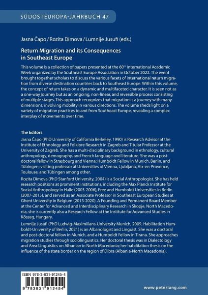 Jasna Capo, Rozita Dimova, Lumnije Jusufi : Preface - Jasna Capo : Introduction: Meandering Through Return Migration and Its Effects - Daniel Göler : Prologue: Return Migration. Theories, Concepts, Findings - With a Special Emphasis on Southeast Europe - Dhimit r Doka, Daniel Göler : Rückkehr nach Albanien. Phasen, Effekte, Perspektiven - Kalie Kërpaçi, Martin Kuka : The Re-Migration of Albanian Returned Migrants - Marsida (Salihi) Tafilica : Entrepreneurship by Albanian Return Migrants - Lumnije Kadriu : Self-Voluntary "Permanent" Return Migration to Post-War Kosovo - Samir Beharic, Azra Berbic, Denis Saric : Bosnian Students Abroad in the Time of a Pandemic: a Global Overview - Darija Hofgräff Maric, Sarah Hofgräff : To the End of the World and Back: Reasons for Returning to Croatia and Levels of Protection in the 19th and 20th Century - Sara Zeric : Factories Built on the Deutsche Mark. Yugoslav Gastarbeiter Investments in Creating Jobs in the Homeland - Linda Paganelli :