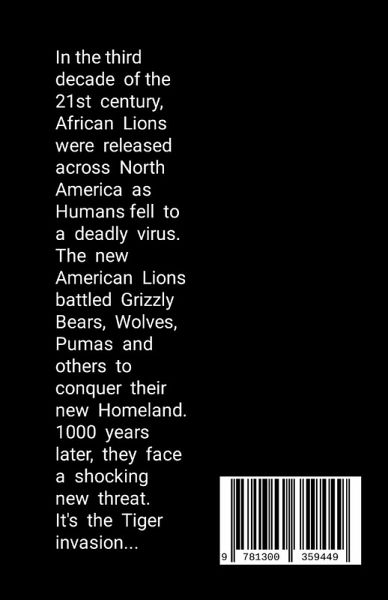 In the third decade of the twenty-first century, African Lions were released across North America as Humanity fell to a deadly virus. The first generation of African Lions struggled to adapt to life outside the zoos of Michigan. They learned to hunt American fauna, battled rival predators such as Wolves, Grizzly Bears and Pumas. They struggled in the winter but adjusted. As the climate changed and the post-human world warmed up, the new American Lions became Kings of North America. A thousand years after the Fall of Humanity, North America has changed drastically. The former major cities are covered with vegetation. Unbeknownst to the Lions, a small population of Siberian tigers and Bengal tigers has survived in places like Quebec and Ontario and their descendants are now encroaching into Lion territory. The Lions must once more fight for survival against formidable enemies...