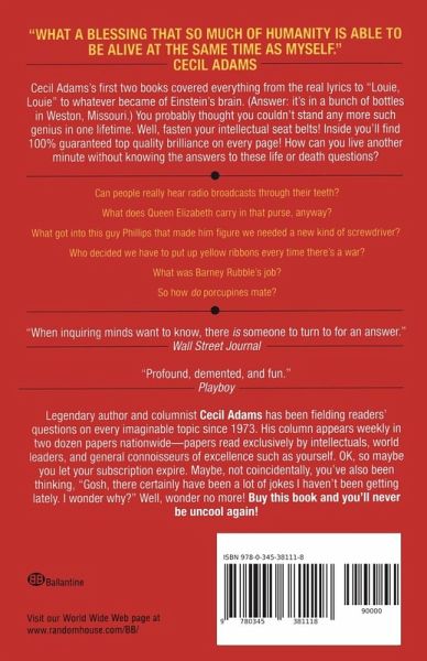 "When inquiring minds want to know, there is someone to turn to for an answer." WALL STREET JOURNAL Cecil Adams's first two books covered everything from the real lyrics to "Louie, Louie," to whatever became of Einstein's brain. You probably thought you couldn't stand any more genius in one lifetime. Well, fasten your intellectual seat belts! Inside you'll find 100% guaranteed top quality brilliance on every page, as he winsomely and wisely answers questions like these: Can people really hear radio broadcasts through their teeth? What does Queen Elizabeth carry in that purse, anyway? So how DO porcupines mate? And many more. When you hear the answers, you'll be glad someone asked the questions.