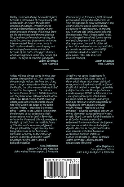 The volume is a bilingual English/Romanian collection of poetry uniting the "Judith Beveridge Poetry Class" in Sydney, Australia, and the Palace of Culture Poetry Group, Literary Connections from Bistrita, Romania. Artists will not always agree in what they express through their art. That would be devastatingly tedious. We have two cities, one - a large metropolis on the shores of the Pacific, the other - a smallish capital of a district in Transylvania. The distance between them is almost 17000 kilometers and they have never influenced each-other. Until now. What chance that the work of artists from such distant realms should find itself within the pages of the same volume? Poetry - breathing a universal ethos - carries to the surface, like a miner, the diamond of our collective artistic subconscious. And as Judith Beveridge writes in her Foreword, this volume reflects the light of truth from the multiple facets of this diamond - in so many different, though splendidly complementary, hues. Congratulations to the Australian-Romanian Academy, to the Palace of Culture in Bistri¿a, and to the "Judith Beveridge Poetry Class"! This is a brilliant initiative! Alex ¿tef¿nescu Literary Critic and Historian