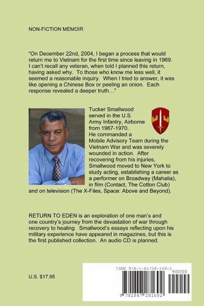 RETURN TO EDEN is an exploration of one man's and one country's journey from the devastation of war through recovery to healing. Tucker Smallwood served in the U.S. Army Infantry, Airborne from 1967-1970. He commanded a Mobile Advisory Team during the Vietnam War and was severely wounded in action. After recovering from his injuries, Smallwood moved to New York to study acting, establishing a career as a performer on Broadway (Mahalia), in film (Contact, The Cotton Club) and on television (The X-Files, Space: Above and Beyond). Smallwood's essays reflecting upon his military experience have appeared in magazines, but this is the first published collection. There are more than fifty photographs, many from his tour of duty and from his return in 2004. RETURN TO EDEN is also available in audio book formats.