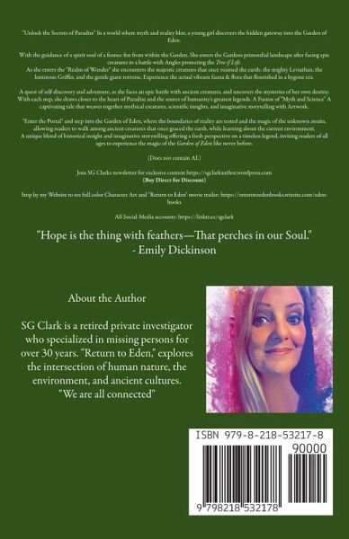 "Unlock the Secrets of Paradise" In a world where myth and reality blur, a young girl discovers the hidden gateway into the Garden of Eden. With the guidance of a spirit soul from within the Garden. She shares a breathtaking journey through the primordial landscape and enters a "Realm of Wonder." Within the Garden's walls, ancient secrets await. Encounter the majestic creatures that once roamed the earth: the mighty Leviathan, the luminous Griffin, and the gentle giant tortoise. Witness the vibrant flora that flourished in a bygone era: the radiant Tree of Life, the shimmering Lotus, and the majestic Cedars of God. A quest of self-discovery and adventure, as she faces an epic battle with ancient creatures, and uncovers the mysteries of her own destiny. With each step, she draws closer to the heart of Paradise and the source of humanity's greatest legends. "A fusion of Myth and Science" This captivating tale weaves together mythical creatures, scientific insights, and imaginative storytelling to create a unique and unforgettable reading experience. "Join the Quest" step into the Garden of Eden, where the boundaries of reality are tested and the magic of the unknown awaits. SG Clark is a debut novelist who delves into the mystical realm of the Garden of Eden. Drawing inspiration from historical records and ancient Mesopotamian artifacts, weaving together fact and fiction to transport readers inside the fabled Garden. With a deep fascination for the biblical account and a passion for uncovering hidden secrets, Clark embarked on a journey to explore the Garden, said to be hidden from human eyes and protected by celestial guardians. Step into the Garden's gates and discover the wonders of the actual flora and fauna of a bygone era, allowing readers to walk among ancient creatures that once graced the earth, while learning about the current environment. In this captivating tale, Clark's unique blend of historical insight and imaginative storytelling offers a fresh perspective on a timeless legend, inviting readers to experience the magic of the Garden of Eden like never before. (Does not contain AI.)