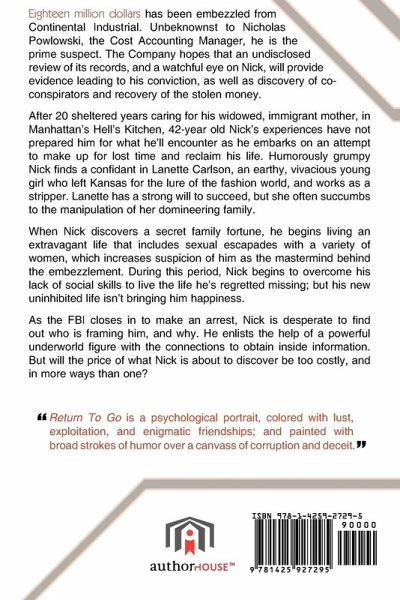Eighteen million dollars has been embezzled from Continental Industrial. Unbeknownst to Nicholas Powlowski, the Cost Accounting Manager, he is the prime suspect. The Company hopes that an undisclosed review of its records, and a watchful eye on Nick, will provide evidence leading to his conviction, as well as discovery of co-conspirators and recovery of the stolen money. After 20 sheltered years caring for his widowed, immigrant mother, in Manhattan's Hell's Kitchen, 42-year old Nick's experiences have not prepared him for what he'll encounter as he embarks on an attempt to make up for lost time and reclaim his life. Humorously grumpy Nick finds a confidant in Lanette Carlson, an earthy, vivacious young girl who left Kansas for the lure of the fashion world, and works as a stripper. Lanette has a strong will to succeed, but she often succumbs to the manipulation of her domineering family. When Nick discovers a secret family fortune, he begins living an extravagant life that includes sexual escapades with a variety of women, which increases suspicion of him as the mastermind behind the embezzlement. During this period, Nick begins to overcome his lack of social skills to live the life he's regretted missing; but his new uninhibited life isn't bringing him happiness. As the FBI closes in to make an arrest, Nick is desperate to find out who is framing him, and why. He enlists the help of a powerful underworld figure with the connections to obtain inside information. But will the price of what Nick is about to discover be too costly, and in more ways than one? "Return to Go is a psychological portrait, colored with lust, exploitation, and enigmatic friendships; and painted with broad strokes of humor over a canvass of corruption and deceit."