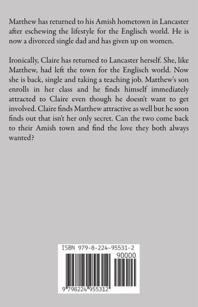 Matthew has returned to his Amish hometown in Lancaster after eschewing the lifestyle for the Englisch world. He is now a divorced single dad and has given up on women. Ironically, Claire has returned to Lancaster herself. She, like Matthew, had left the town for the Englisch world. Now she is back, single and taking a teaching job. Matthew's son enrolls in her class and he finds himself immediately attracted to Claire even though he doesn't want to get involved. Claire finds Matthew attractive as well but he soon finds out that isn't her only secret. Can the two come back to their Amish town and find the love they both always wanted?