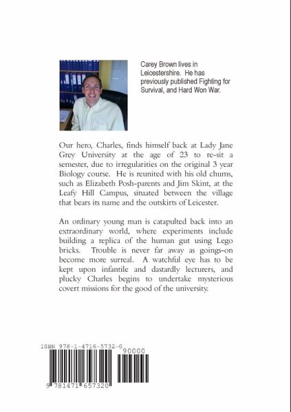 Return to Leafy Hill takes the reader with a sense of humour into a crazy world of adventure that is degree level Biology at a university that is anything but normal. Our hero, Charles, finds himself back at Lady Jane Grey University at the age of 23 to re-sit a semester, due to irregularities on the original 3 year Biology course. He is reunited with his old chums, such as Elizabeth Posh-parents and Jim Skint, at the Leafy Hill Campus, situated between the village that bears its name and the outskirts of Leicester. An ordinary young man is catapulted back into an extraordinary world, where experiments include building a replica of the human gut using Lego bricks. Trouble is never far away as goings-on become more surreal. A watchful eye has to be kept upon infantile and dastardly lecturers, and plucky Charles begins to undertake mysterious covert missions for the good of the university.