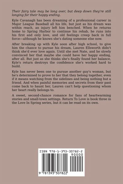 Their fairy tale may be long over, but deep down they're still longing for their happy ending. Kyle Cavanagh has been dreaming of a professional career in Major League Baseball all his life, but just as his dream was within reach, an injury left him benched. When he returns home to Spring Harbor to continue his rehab, he runs into his first and only love, and old feelings creep back in full force—although he knows she's dating someone else now. After breaking up with Kyle soon after high school, to give him the chance to pursue his dream, Lauren Ellsworth didn't think she'd ever love again. Until she met Nate, and he slowly convinced her that maybe she could have her happy ending, after all. But just as she thinks she's finally found her balance, Kyle's return destroys the confidence she's worked hard to build. Kyle has never been one to pursue another guy's woman, but he's determined to prove to her that they belong together, even if it means watching from the sidelines and being nothing but a friend. And when painful memories and secrets from their past come back to haunt her, Lauren can't help questioning whom her heart really belongs to. A sweet, second-chance romance for fans of heartwarming stories and small-town settings. Return To Love is book three in the Love In Spring series, but it can be read on its own.