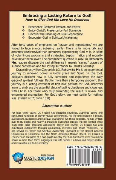 Embracing a Lasting Return to God! How to Give God the Love He Deserves Experience Restored Passion and Power Enjoy Christ's Presence by Full Surrender Discover the Meaning of True Repentance Encounter God in Spiritual Awakening After forty years of emphases on "prayer and repentance," we are forced to face a most sobering reality. There is far more talk and activities about revival than genuinely experiencing God in it. In spite of voluminous programs and strategies, baptism ratios and morality have never been lower. The preeminent question is why? In Return to Me, readers discover the vast difference in merely "saying" prayers of surface confession and full loving surrender to Christ's Lordship. Drawn directly from Zechariah 1:3, Return to Me is an experiential journey to renewed power in God's grace and Spirit. In this tool, believers discover how to fully surrender and experience the daily grace of spiritual fullness. But far more than a temporary program, this journey is a lasting covenant of first love passion for God. Believers learn to embrace the essential steps of lasting obedience and closeness with Christ. For those who truly surrender, the result is revival and empowered evangelism. For God's glory, we must settle for nothing less. (Isaiah 43:7; John 15:8)