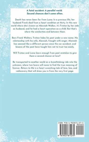 A fatal accident. A parallel world. Second chances don't come often. Death has never been far from Lana. In a previous life, her husband Frank died from a heart condition at thirty. In this new world where she's known as Alannah Walker, it's Tristan by her side as husband, and he had a heart operation as a child. But that's where the similarities end between them. Born Frank Walters, Tristan hides his past under a new name. His relationship with his wife, Alannah, fraught with anger. Alannah has seemed like a different person since the car accident, and lessons of the past have taught him not to trust too easily. Will Tristan and Lana learn enough from past mistakes to give them a second chance at love? Be transported to another world on a breathtaking ride into the unknown, where two lovers will come to find the true meaning of forever. Return to Me is a heart wrenching tale of love, loss, and rediscovery that will draw you in from the very first page. Buy Return to Me now and lose yourself in a world where second chances make anything possible.' Return to Me was a compelling fast read with an interesting likeable heroine. ...the "what if" story line had a fascinating Twilight Zone type feel to it that will appeal to a wide variety of readers.' Four star review by Pennydreadfulbooks