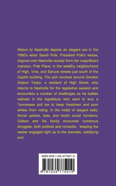 Set in 1887, Return to Nashville depicts an elegant era when Sarah Polk, President Polk's widow, reigned over Nashville society from her magnificent mansion, Polk Place, in the wealthy neighborhood of High, Vine, and Spruce streets just south of the Capitol building. The plot revolves around Senator Gideon Taylor, a resident of High Street, who returns to Nashville for the legislative session and encounters a number of challenges as he battles radicals in the senate who want to levy a poll tax to keep freedmen and poor whites from voting. In the midst of elegant balls, dinner parties, teas, and lavish social functions, Gideon and his family encounter numerous struggles, both political and romantic, keeping the reader engaged right up to the dramatic, satisfying end.