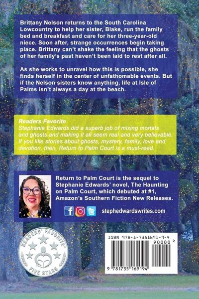 Brittany Nelson returns to the South Carolina Lowcountry to help her sister, Blake, run the family bed and breakfast and care for her three-year-old niece. Soon after, strange occurrences begin taking place. Brittany can't shake the feeling that the ghosts of her family's past haven't been laid to rest, after all. As she works to unravel how this is possible, she finds herself in the center of unfathomable events. But if the Nelson sisters know anything, life at Isle of Palms isn't always a day at the beach. Readers Favorite, Five-Star Review Stephanie Edwards did a superb job of mixing mortals and ghosts and making it all seem real and very believable. If you like stories about ghosts, mystery, family love and devotion, then, Return to Palm Court is a must-read. GoodReads Reviewer "I am deaf & it was so refreshing to see a main character that I can identify with ... It was a very easy read and I found myself unable to put the book down. I enjoyed the vivid descriptions of the areas that they were from, as well as the area in South Carolina that they ran their Bed & Breakfast from."
