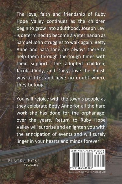 The love, faith and friendship of Ruby Hope Valley continues as the children begin to grow into adulthood. Joseph Levi is determined to become a Veterinarian as Samuel John struggles to walk again. Betty Anne and Sara Jane are always there to help them through the tough times with their support. The adopted children, Jacob, Cindy, and Daisy, love the Amish way of life; and have no doubt where they belong. You will rejoice with the town’s people as they celebrate Betty Anne for all the hard work she has done for the orphanage, over the years. Return to Ruby Hope Valley will surprise and enlighten you with the anticipation of events and will surely linger in your hearts and minds forever.