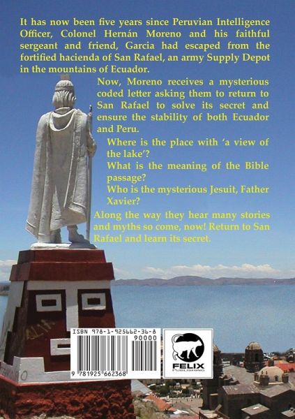 It has now been five years since Peruvian Intelligence Officer, Colonel Hernán Moreno and his faithful sergeant and friend, Garcia had escaped from the fortified hacienda of San Rafael, an army Supply Depot in the mountains of Ecuador. Now, Moreno receives a mysterious coded letter asking them to return to San Rafael to solve its secret and ensure the stability of both Ecuador and Peru. Where is the place with 'a view of the lake'? What is the meaning of the Bible passage? Who is the mysterious Jesuit, Father Xavier? Along the way they hear many stories and myths so come, now! Return to San Rafael and learn its secret. Return to San Rafael is the sequel to Letters from San Rafael also published by Felix Publishing. Letters from San Rafael was a collection of letters covering the stories of history and culture of South America woven through a story of capture and intrigue, The Return to San Rafael sees the main protagonists meet up again to solve a mystery to hopefully stop abuse of power and political intrigue. Stories of culture and history are explained on the way as the friends catch up after 5 years away. Respectful of culture whilst maintaining the action and intrigue. You will not want to put this down. It is a well-researched, culturally and historically accurate work of fiction. Even the author is fictitious.