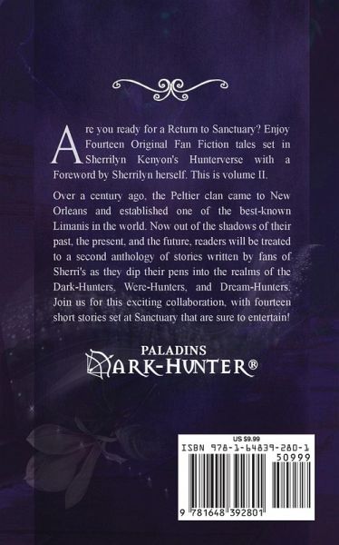 Are you ready for a Return to Sanctuary? Enjoy Fourteen Original Fan Fiction tales set in Sherrilyn Kenyon's Hunterverse with a Foreword by Sherrilyn herself. This is volume II. Over a century ago, the Peltier clan came to New Orleans and established one of the best-known Limanis in the world. Now out of the shadows of their past, the present, and the future, readers will be treated to a second anthology of stories written by fans of Sherri's as they dip their pens into the realms of the Dark-Hunters, Were-Hunters, and Dream-Hunters. Join us for this exciting collaboration, with fourteen short stories set at Sanctuary that are sure to entertain!