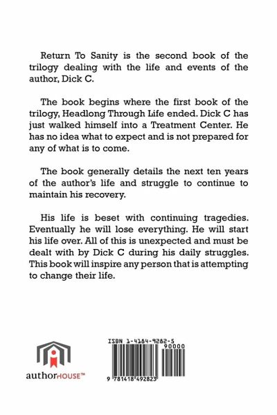 Return To Sanity is the second book of the trilogy dealing with the life and events of the author, Dick C. The book begins where the first book of the trilogy, Headlong Through Life ended. Dick C has just walked himself into a Treatment Center. He has no idea what to expect and is not prepared for any of what is to come. The book generally details the next ten years of the author's life and struggle to continue to maintain his recovery. His life is beset with continuing tragedies. Eventually he will lose everything. He will start his life over. All of this is unexpected and must be dealt with by Dick C during his daily struggles. This book will inspire any person that is attempting to change their life.