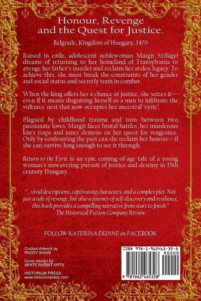 Honour, revenge, and the quest for justice. Belgrade, Kingdom of Hungary, 1470 Raised in exile, adolescent noblewoman Margit Szilágyi dreams of returning to her homeland of Transylvania to avenge her father's murder and reclaim her stolen legacy. To achieve this, she must break the constraints of her gender and social status and secretly train in combat. When the king offers her a chance at justice, she seizes it - even if it means disguising herself as a man to infiltrate the vultures' nest that now occupies her ancestral 'eyrie'. Plagued by childhood trauma and torn between two passionate loves, Margit faces brutal battles, her murderous kin's traps and inner demons on her quest for vengeance. Only by confronting the past can she reclaim her honour - if she can survive long enough to see it through. Return to the Eyrie is an epic coming-of-age tale of a young woman's unwavering pursuit of justice and destiny in 15th century Hungary. "Vivid descriptions, captivating characters, and a complex plot. Not just a tale of revenge, but also a journey of self-discovery and resilience, this book provides a compelling narrative from start to finish." - The Historical Fiction Company Review
