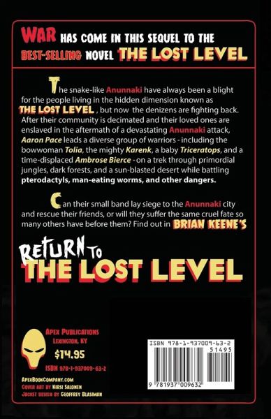 War has come in this sequel to the best-selling novel THE LOST LEVEL. The snake-like Anunnaki have always been a blight for the people living in the hidden dimension known as the Lost Level, but now, the denizens are fighting back. After their community is decimated and their loved ones are enslaved in the aftermath of a devastating Anunnaki attack, Aaron Pace leads a diverse group of warriors -- including the bowwoman Tolia, the mighty Karenk, a baby Triceratops, and a time-displaced Ambrose Bierce -- on a trek through primordial jungles, dark forests, and a sun-blasted desert while battling pterodactyls, man-eating worms, and other dangers. Can their small band lay siege to the Anunnaki city and rescue their friends, or will they suffer the same cruel fate so many others have before them? Find out in Brian Keene's RETURN TO THE LOST LEVEL. Includes a bonus short story!