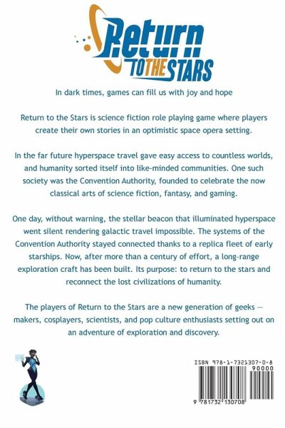 In dark times, games can fill us with joy and hope. Return to the Stars, a tabletop science fiction role playing game, helps players create their own stories in an optimistic space opera setting. Return to the Stars is designed to allow the creation of characters that evoke the best elements of geek culture. In the far future hyperspace travel gave easy access to countless worlds, and humanity sorted itself into like-minded communities. One such society was the Convention Authority, founded to celebrate the now classical arts of science fiction, fantasy, and gaming. One day, without warning, the stellar beacon that illuminated hyperspace went silent rendering galactic travel impossible. The systems of the Convention Authority stayed connected thanks to a replica fleet of early starships. Now, after more than a century of effort, a long-range exploration craft has been built. Its purpose: to return to the stars and reconnect with lost civilizations of humanity. The characters of Return to the Stars are a new generation of geeks - makers, cosplayers, scientists, and pop culture enthusiasts setting out on an adventure of exploration and discovery. If you enjoy tales filled with optimism and hope, where players can paint a better future in bold primary colors, then you should prepare to Return to the Stars!¿