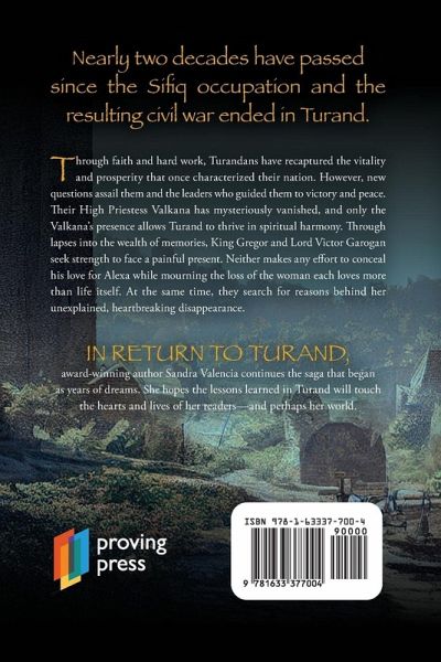 Nearly two decades have passed since the Sifiq occupation and the resulting civil war ended in Turand. Through faith and hard work, Turandans have recaptured the vitality and prosperity that once characterized their nation. However, new questions assail them and the leaders who guided them to victory and peace. Their High Priestess Valkana has mysteriously vanished, and only the Valkana's presence allows Turand to thrive in spiritual harmony. Through lapses into the wealth of memories, King Gregor and Lord Victor Garogan seek strength to face a painful present. Neither makes any effort to conceal his love for Alexa while mourning the loss of the woman each loves more than life itself. At the same time, they search for reasons behind her unexplained, heartbreaking disappearance. In Return to Turand, award-winning author Sandra Valencia continues the saga that began as years of dreams. She hopes the lessons learned in Turand will touch the hearts and lives of her readers-and perhaps her world.