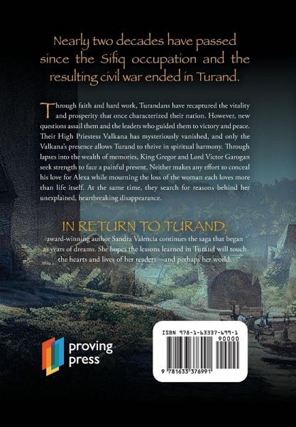 Nearly two decades have passed since the Sifiq occupation and the resulting civil war ended in Turand. Through faith and hard work, Turandans have recaptured the vitality and prosperity that once characterized their nation. However, new questions assail them and the leaders who guided them to victory and peace. Their High Priestess Valkana has mysteriously vanished, and only the Valkana's presence allows Turand to thrive in spiritual harmony. Through lapses into the wealth of memories, King Gregor and Lord Victor Garogan seek strength to face a painful present. Neither makes any effort to conceal his love for Alexa while mourning the loss of the woman each loves more than life itself. At the same time, they search for reasons behind her unexplained, heartbreaking disappearance. In Return to Turand, award-winning author Sandra Valencia continues the saga that began as years of dreams. She hopes the lessons learned in Turand will touch the hearts and lives of her readers-and perhaps her world.