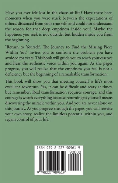 Have you ever felt lost in the chaos of life? Have there been moments when you were stuck between the expectations of others, distanced from your true self, and could not understand the reason for that deep emptiness inside you? Maybe the happiness you seek is not outside, but hidden inside you from the beginning. "Return to Yourself: The Journey to Find the Missing Piece Within You" invites you to confront the problem you have avoided for years. This book will guide you to reach your essence and hear the authentic voice within you again. As the pages progress, you will realize that the emptiness you feel is not a deficiency but the beginning of a remarkable transformation. This book will show you that meeting yourself is life's most excellent adventure. Yes, it can be difficult and scary at times, but remember: Real transformation requires courage, and this courage is worth everything because returning to yourself means discovering the miracle within you. And you are never alone on this journey. As you progress through the pages, you will rewrite your own story, realize the limitless potential within you, and regain control of your life.