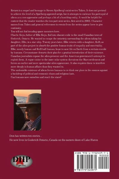 Return is a sequel and homage to Steven Spielberg's mini-series Taken. It does not pretend to achieve the level of a Spielberg approved script, but it attempts to embrace his portrayal of aliens as a non-aggressive and perhaps a bit of a bumbling entity. It would be helpful for the reader to have watched the ten-part mini-series, first aired in 2002. It would be good to get familiar with E.T. and Close Encounters of the Third Kind to get a feel for Spielberg's portrayal of star visitors.You will not find invading space monsters here.Some of the character names from Taken and general references to events from the series appear here to give continuity.Charlie Keys, father of Ellie Keys, fled into obscure exile to the small Canadian town of Goderich, Ontario. He wanted to escape the notoriety surrounding the aliens taking his daughter, Ellie, up in a star-ship. Twenty years later, Ellie returns with a daughter, RoH, as part of the alien project to absorb the positive human traits of empathy and conviviality.Ellie, mostly human and RoH half-human, hope to save life on Earth from a certain ecocide by humans. Circumstance thwarts their plan for a gradual introduction of their existence. Canadian journalists expose the alien presence and the American government's attempt to exploit them. A rogue visitor to the inner solar system threatens the Mars settlement and forces an earlier and more spectacular alien appearance. It also requires them to interfere more deeply in human affairs than they wanted to.The undeniable existence of aliens forces humans to re-think our place in the cosmos against a backdrop of political and economic chaos and religious hate.