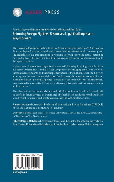 This book, a follow-up publication to the 2016 volume Foreign Fighters under International Law and Beyond, zooms in on the responses that the international community and individual States are implementing in response to (prospective and actual) returning foreign fighters (FFs) and their families, focusing on returnees from Syria and Iraq to European countries.