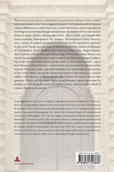 This book is proposed as a contribution to postcolonial critiques of the colonial and postcolonial exotic. It investigates the exotic as a representation of colonial cultural difference in colonial discourse, culture and history, and its oppositional rewritings in postcolonial thought and literature. Its analyses of the exotic include classical Arabo-Islamic ethnographic texts, Marco Polo's and Mandeville's travel accounts, Shakespeare's The Tempest, Montesquieu's Lettres Persanes, and a variety of colonial and postcolonial texts. Its Deconstructive approach to the exotic breaks new grounds of analysis beyond the Saidian problematic of «Orientalism», Homi Bhabha's intervention on the exotic, Hegel's Master/Slave dialectic, Michel Foucault's archaeology of Western cultural history, and Sartre's theorization of the «gaze» and its underlying Phenomenological subject. The scope of critical discussions of the exotic in this book includes - apart from Western cultural history - postmodern and postcolonial critiques of the colonial Other and exotic, and anthropological and philosophical discussions of the exotic. While tracing the divided inscription of the exotic as a colonial subject with reference to Shakespeare's The Tempest, the author throws into question l'Exote and the exotic Other as problematic subject positions for reading and rewriting the exotic in cultural history, and the double binds of counter-Exoticist discourses.