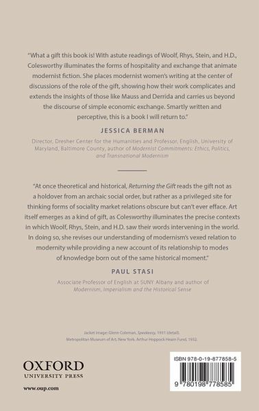 Introduction 1: Marcel Mauss and the Turn to the Gift 2: Virginia Woolf and the Limits of Feminine Hospitality 3: Jean Rhys and the Fiction of Failed Reciprocity 4: Gertrude Stein and the Politics of Literary Genius 5: H.D. and the Promise of Queer Kinship Coda: For New York 1941 from London 1941