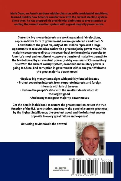 Returning to America is the only real game plan in sight for 300 million to reclaim America the Beautiful from 536 failed politicians! It is also the only plan with power to do it! Includes - How 300 million can have a stronger voice than 536 failed politicians! How to end political corruption in one year! How to end the sale of the people's state to a corporate state, foreign state, and communist state with talk of treason! How to end competition with billions earning $2.00 per day! How to restore a nation opposite to every great failure and expense, and much more! This book is the smartest investment of your lifetime for saving the nation of your dreams and all you value within it! Why should 300 million own this book? Without a game plan, 300 million are losing to 536 failed politicians! Without this less than $20.00 investment, all financial and military power will go to China! Those who fail to own this book are giving their prosperity and power to China! This book will change America!