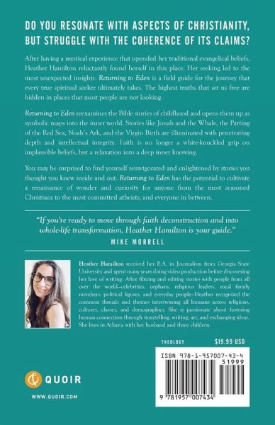 Do you resonate with aspects of Christianity, but struggle with the coherence of its claims? After having a mystical experience that upended her traditional evangelical beliefs, Heather Hamilton reluctantly found herself in this place. Her seeking led to the most unexpected insights. Returning to Eden is a field guide for the journey that every true spiritual seeker ultimately takes. The highest truths that set us free are hidden in places that most people are not looking. Returning to Eden reexamines the Bible stories of childhood and opens them up as symbolic maps into the inner world. Stories like Jonah and the Whale, the Parting of the Red Sea, Noah's Ark, and the Virgin Birth are illuminated with penetrating depth and intellectual integrity. Faith is no longer a white-knuckled grip on implausible beliefs, but a relaxation into a deep inner knowing. You may be surprised to find yourself reinvigorated and enlightened by stories you thought you knew inside and out. Returning to Eden has the potential to cultivate a renaissance of wonder and curiosity for anyone from the most seasoned Christians to the most committed atheists, and everyone in between.
