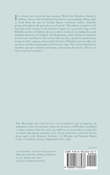 In connection with his 1864 visitation, Walter Kerr Hamilton, Bishop of Salisbury, sent to each incumbent in his diocese a questionnaire asking under 52 heads about the state of worship, dissent, education, welfare, charitable giving and religious life generally in each parish. This edition comprises a full transcript of the returns to the visitation enquiry by 249 parish clergy in the Wiltshire portion of Salisbury diocese as then constituted (excluding the north Wiltshire deaneries of Cricklade and Malmesbury, which had been transferred to Gloucester and Bristol). The returns offer not only a parish-by-parish survey of aspects of the religious and social life of much of Wiltshire, but also reflect the character, attitudes and prejudices of Victorian clergy. The volume introduction describes episcopal visitation and enquiry, and analyses the returns. There is an index of persons and places.