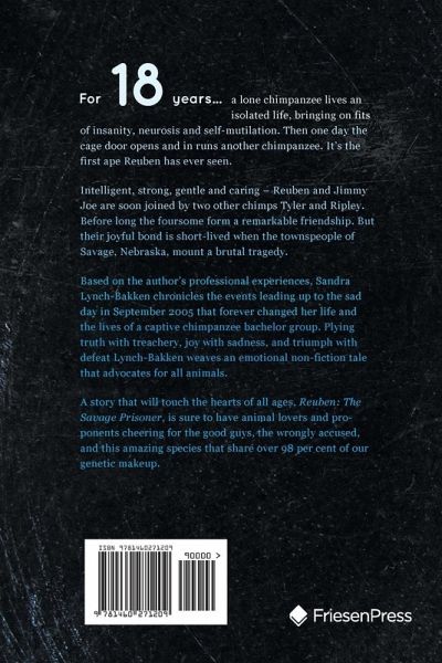 For 18 years... a lone chimpanzee lives an isolated life, bringing on fits of insanity, neurosis and self-mutilation. Then one day the cage door opens and in runs another chimpanzee. It's the first ape Reuben has ever seen. Intelligent, strong, gentle and caring - Reuben and Jimmy Joe are soon joined by two other chimps Tyler and Ripley. Before long the foursome form a remarkable friendship. But their joyful bond is short-lived when the townspeople of Savage, Nebraska, mount a brutal tragedy. Based on the author's professional experiences, Sandra Lynch-Bakken chronicles the events leading up to the sad day in September 2005 that forever changed her life and the lives of a captive chimpanzee bachelor group. Plying truth with treachery, joy with sadness, and triumph with defeat Lynch-Bakken weaves an emotional non-fiction tale that advocates for all animals. A story that will touch the hearts of all ages, Reuben: The Savage Prisoner, is sure to have animal lovers and proponents cheering for the good guys, the wrongly accused, and this amazing species that share over 98 per cent of our genetic makeup.