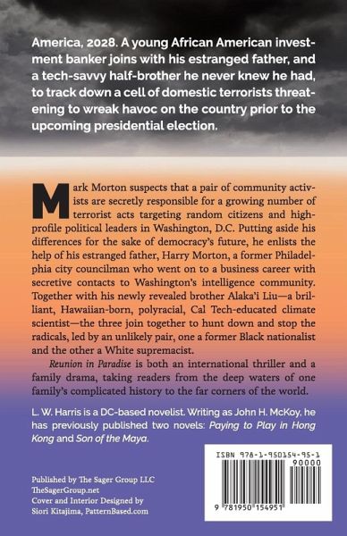 America, 2028. A young African American investment banker joins with his estranged father, and a tech-savvy half-brother he never knew he had, to track down a cell of domestic terrorists threatening to wreak havoc on the country prior to the upcoming presidential election. Mark Morton suspects that a pair of community activists are secretly responsible for a growing number of terrorist acts targeting random citizens and high-profile political leaders in Washington, D.C. Putting aside his differences for the sake of democracy's future, he enlists the help of his estranged father, Harry Morton, a former Philadelphia city councilman who went on to a business career with secretive contacts to Washington's intelligence community. Together with his newly revealed brother Alaka'i Liu-a brilliant, Hawaiian-born, polyracial, Cal Tech-educated climate scientist-the three join together to hunt down and stop the radicals, led by an unlikely pair, one a former Black nationalist and the other a White supremacist. Reunion in Paradise is both an international thriller and a family drama, taking readers from the deep waters of one family's complicated history to the far corners of the world.