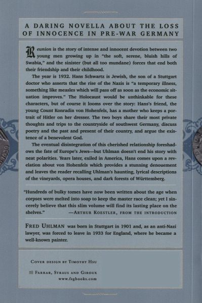 A daring novella about the loss of innocence in pre-war Germany. Reunion is the story of intense and innocent devotion between two young men growing up in "the soft, serene, bluish hills of Swabia," and the sinister (but all too mundane) forces that end both their friendship and their childhood. The year is 1932. Hans Schwartz is Jewish, the son of a Stuttgart doctor who asserts that the rise of the Nazis is "a temporary illness, something like measles which will pass off as soon as the economic situation improves." The Holocaust would be unthinkable for these characters, but of course it looms over the story: Hans's friend, the young Count Konradin von Hohenfels, has a mother who keeps a portrait of Hitler on her dresser. The two boys share their most private thoughts and trips to the countryside of southwest Germany, discuss poetry and the past and present of their country, and argue the existence of a benevolent God. The eventual disintegration of this cherished relationship foreshadows the fate of Europe's Jews-- but Uhlman doesn't end his story with neat polarities. Years later, exiled in America, Hans comes upon a revelation about von Hohenfels which provides a stunning denouement and leaves the reader recalling Uhlman's haunting, lyrical descriptions of the vineyards, opera houses, and dark forests of Württemberg. "Hundreds of bulky tomes have now been written about the age when corpses were melted into soap to keep the master race clean; yet I sincerely believe that this slim volume will find its lasting place on the shelves."--Arthur Koestler, from the Introduction