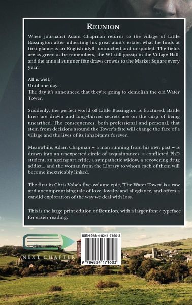 When journalist Adam Chapman returns to the village of Little Bassington after inheriting his great aunt's estate, what he finds at first glance is an English idyll, untouched and unspoiled. The fields are as green as he remembers, the WI still gossip in the Village Hall, and the annual summer fête draws crowds to the Market Square every year. All is well. Until one day. The day it's announced that they're going to demolish the old Water Tower. Suddenly, the perfect world of Little Bassington is fractured. Battle lines are drawn and long-buried secrets are on the cusp of being unearthed. The consequences, both professional and personal, that stem from decisions around the Tower's fate will change the face of a village and the lives of its inhabitants forever. Meanwhile, Adam Chapman - a man running from his own past - is drawn into an unexpected circle of acquaintances: a conflicted PhD student, an ageing art critic, a sympathetic widow, a recovering drug addict... and the woman from the Library to whom each of them will become inextricably linked. The first in Chris Vobe's five-volume epic, 'The Water Tower' is a raw and uncompromising tale of love, loyalty and allegiance, and offers a candid exploration of the way we deal with loss. This is the large print edition of Reunion, with a larger font / typeface for easier reading.