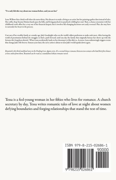 "I've only felt this way about one woman before, and you are her." Luna Willows hits a brick wall when she turns thirty. Her dream is to make a living as an artist, but her paintings gather dust instead of sales. Her coffee shop Steamy Hotties barely pays the bills, and living paycheck to paycheck is killing her soul. Then, a chance encounter with her childhood crush offers her a way out of her financial despair, but it involves life-changing decisions not easily reversed. Plus, she may have to surrender her heart in the process. Cast out of her wealthy family at a tender age, Jade Goodnight relies on the world's oldest profession to make ends meet. After leaving the world of prostitution behind she struggles to find a path forward, until one day the family that originally betrays her shows up with the fortune she's long been denied. When Luna accidentally lands on her doorstep it is like déjà vu. As teens, Luna unknowingly triggers events that change Jade's life forever. Sixteen years later, the curvy artist is about to turn Jade's world upside down again. Reunited is the third and final story in the Finding Love Again series. It's a second chance romance between two women who had their first chance at love stolen from them. Reunited can be read as a standalone lesbian romance novel.