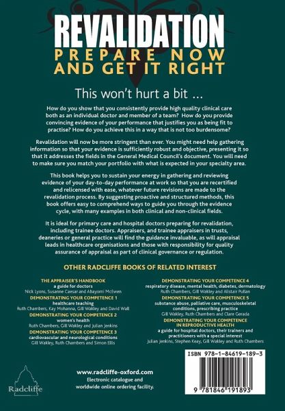 This won't hurt a bit...How do you show that you consistently provide high quality clinical care both as an individual doctor and member of a team? How do you provide convincing evidence of your performance that justifies you as being fit to practise? And how do you achieve this in a way that is not too burdensome?Revalidation will now be more stringent that ever. You might need help gathering information so that your evidence is sufficiently robust and objective, presenting it so that addresses the fields in the General Medical Council's document. You'll need to make sure you match your portfolio with what is expected in your specialty area.This book helps you to sustain your energy in gathering and reviewing evidence of your day-to-day performance at work so that you are recertified and relicensed with ease, whatever future revisions are made to the revalidation process. By suggesting proactive and structured methods, this book offers easy to comprehend ways to guide you through the evidence cycle, with many examples in both clinical and non-clinical fields. It is ideal for primary care and hospital doctors preparing for revalidation, including trainee doctors. Appraisers, and trainee appraisers in trusts, deaneries or general practice will find the guidance invaluable, as will appraisal leads in healthcare organisations and those with responsibility for quality assurance of appraisal as part of clinical governance or regulation.