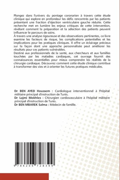 Plongez dans l'univers du pontage coronarien à travers cette étude clinique qui explore en profondeur les défis rencontrés par les patients présentant une fraction d'éjection ventriculaire gauche réduite. Cette recherche met en lumière les enjeux critiques de cette intervention, révélant comment la préparation et la sélection des patients peuvent influencer le parcours de soins.À travers une analyse rigoureuse et des observations pertinentes, ce livre examine les facteurs de risque, les complications potentielles et les implications pour les pratiques cliniques. Il offre un éclairage précieux sur la façon dont une approche personnalisée peut améliorer les résultats pour ces patients vulnérables.Destiné aux professionnels de la santé, aux chercheurs et aux familles touchées par les maladies cardiaques, cet ouvrage fournit des connaissances essentielles pour mieux comprendre les réalités de la chirurgie cardiaque. Découvrez comment cette étude clinique contribue à transformer des vies et à orienter les futures pratiques médicales.