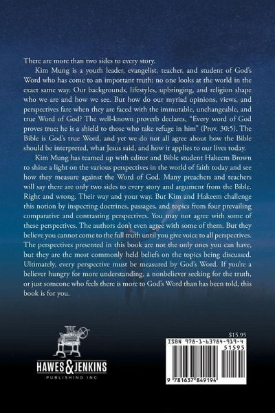 There are more than two sides to every story. Kim Mung is a youth leader, evangelist, teacher, and student of God's Word who has come to an important truth: no one looks at the world in the exact same way. Our backgrounds, lifestyles, upbringing, and religion shape who we are and how we see. But how do our myriad opinions, views, and perspectives fare when they are faced with the immutable, unchangeable, and true Word of God? The well-known proverb declares, "Every word of God proves true; he is a shield to those who take refuge in him" (Prov. 30:5). The Bible is God's true Word, and yet we do not all agree about how the Bible should be interpreted, what Jesus said, and how it applies to our lives today. Kim Mung has teamed up with editor and Bible student Hakeem Brown to shine a light on the various perspectives in the world of faith today and see how they measure against the Word of God. Many preachers and teachers will say there are only two sides to every story and argument from the Bible. Right and wrong. Their way and your way. But Kim and Hakeem challenge this notion by inspecting doctrines, passages, and topics from four prevailing comparative and contrasting perspectives. You may not agree with some of these perspectives. The authors don't even agree with some of them. But they believe you cannot come to the full truth until you give voice to all perspectives. The perspectives presented in this book are not the only ones you can have, but they are the most commonly held beliefs on the topics being discussed. Ultimately, every perspective must be measured by God's Word. If you're a believer hungry for more understanding, a nonbeliever seeking for the truth, or just someone who feels there is more to God's Word than has been told, this book is for you.
