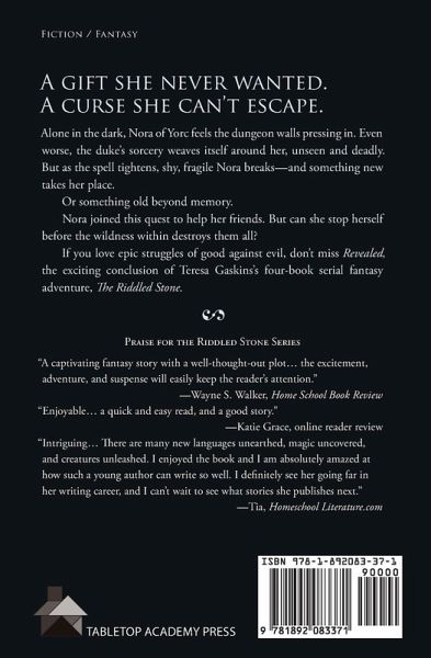 A gift she never wanted. A curse she can't escape. Alone in the dark, Nora of Yorc feels the dungeon walls pressing in. Even worse, the duke’s sorcery weaves itself around her, unseen and deadly. But as the spell tightens, shy, fragile Nora breaks — and something new takes her place. Or something old beyond memory. Nora joined this quest to help her friends. But can she stop herself before the wildness within destroys them all? If you love epic struggles of good against evil, don’t miss Revealed, the exciting conclusion of Teresa Gaskins’s four-book serial fantasy adventure, The Riddled Stone.