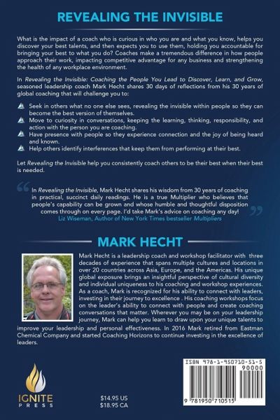 What is the impact of a coach who is curious in who you are and what you know, helps you discover your best talents, and then expects you to use them, holding you accountable for bringing your best to what you do? Coaches make a tremendous difference in how people approach their work, impacting competitive advantage for any business and strengthening the health of any workplace environment. In Revealing the Invisible: Coaching the People You Lead to Discover, Learn, and Grow, seasoned leadership coach Mark Hecht shares 30 days of reflections from his 30 years of global coaching that will challenge you to: Seek in others what no one else sees, revealing the invisible within people so they can become the best version of themselves. Move to curiosity in conversations, keeping the learning, thinking, responsibility, and action with the person you are coaching. Have presence with people so they experience connection and the joy of being heard and known. Help others identify interferences that keep them from performing at their best. Let Revealing the Invisible help you consistently coach others to be their best when their best is needed.