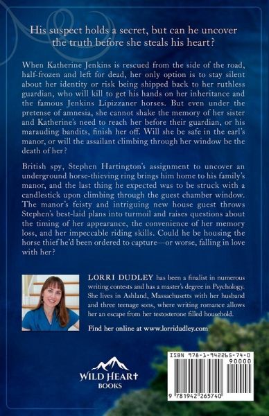 His suspect holds a secret, but can he uncover the truth before she steals his heart? When Katherine Jenkins is rescued from the side of the road, half-frozen and left for dead, her only option is to stay silent about her identity or risk being shipped back to her ruthless guardian, who will kill to get his hands on her inheritance and the famous Jenkins Lipizzaner horses. But even under the pretense of amnesia, she cannot shake the memory of her sister and Katherine's need to reach her before their guardian, or his marauding bandits, finish her off. Will she be safe in the earl's manor, or will the assailant climbing through her window be the death of her? British spy, Stephen Hartington's assignment to uncover an underground horse-thieving ring brings him home to his family's manor, and the last thing he expected was to be struck with a candlestick upon climbing through the guest chamber window. The manor's feisty and intriguing new house guest throws Stephen's best-laid plans into turmoil and raises questions about the timing of her appearance, the convenience of her memory loss, and her impeccable riding skills. Could he be housing the horse thief he'd been ordered to capture-or worse, falling in love with her?