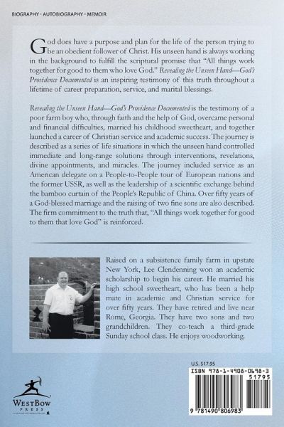 God does have a purpose and plan for the life of the person trying to be an obedient follower of Christ. His unseen hand is always working in the background to fulfill the scriptural promise that "All things work together for good to them who love God." Revealing the Unseen Hand-God's Providence Documented is an inspiring testimony of this truth throughout a lifetime of career preparation, service, and marital blessings. Revealing the Unseen Hand-God's Providence Documented is the testimony of a poor farm boy who, through faith and the help of God, overcame personal and financial difficulties, married his childhood sweetheart, and together launched a career of Christian service and academic success. The journey is described as a series of life situations in which the unseen hand controlled immediate and long-range solutions through interventions, revelations, divine appointments, and miracles. The journey included service as an American delegate on a People-to-People tour of European nations and the former USSR, as well as the leadership of a scientific exchange behind the bamboo curtain of the People's Republic of China. Over fifty years of a God-blessed marriage and the raising of two fine sons are also described. The firm commitment to the truth that, "All things work together for good to them that love God" is reinforced.