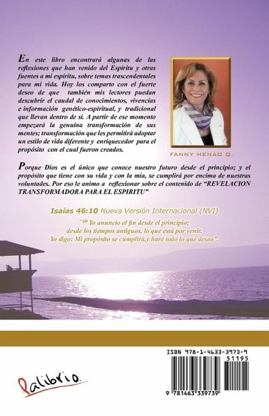 En este libro encontrará algunas de las reflexiones que han venido del Espíritu y otras fuentes a mi espíritu, sobre temas trascendentales para mi vida. Hoy los comparto con el fuerte deseo de que también mis lectores puedan descubrir el caudal de conocimientos, vivencias e información genético-espiritual, y tradicional que llevan dentro de sí. A partir de ese momento empezará la genuina transformación de sus mentes; transformación que les permitirá adoptar un estilo de vida diferente y enriquecedor para el propósito con el cual fueron creados. Porque Dios es el único que conoce nuestro futuro desde el principio; y el propósito que tiene con su vida y con la mía, se cumplirá por encima de nuestras voluntades. Por eso le animo a reflexionar sobre el contenido de "REVELACION TRANSFORMADORA PARA EL ESPIRITU"