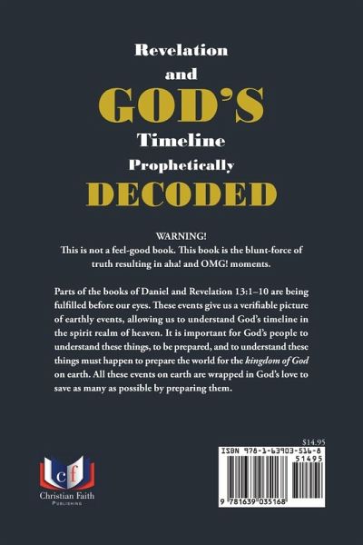 WARNING! This is not a feel-good book. This book is the blunt-force of truth resulting in aha! and OMG! moments. Parts of the books of Daniel and Revelation 13:1-10 are being fulfilled before our eyes. These events give us a verifiable picture of earthly events, allowing us to understand God's timeline in the spirit realm of heaven. It is important for God's people to understand these things, to be prepared, and to understand these things must happen to prepare the world for the kingdom of God on earth. All these events on earth are wrapped in God's love to save as many as possible by preparing them.
