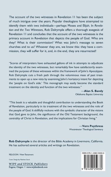 The account of the two witnesses in Revelation 11 has been the subject of much intrigue over the years. Popular theologians have attempted to identify them with two individuals--perhaps Moses and Elijah. In Revelation and the Two Witnesses, Rob Dalrymple offers a thorough exegesis of Revelation 11 and concludes that the account of the two witnesses is the primary account in Revelation that depicts the people of God. Who are they? What is their commission? What was John's message to seven churches and to us? Whoever they are, we know this: they have a commission, they will suffer for it, and, in the end, they are resurrected!