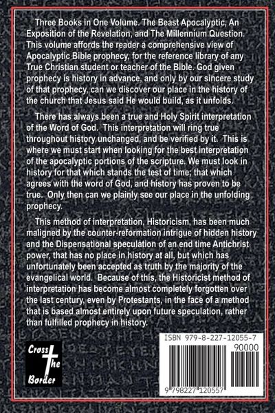 Three Books in One Volume. The Beast Apocalyptic, An Exposition of the Revelation, and The Millennium Question. This volume affords the reader a comprehensive view of Apocalyptic Bible prophecy, for the reference library of any True Christian student or teacher of the Bible. God given prophecy is history in advance, and only by our sincere study of that prophecy, can we discover our place in the history of the church that Jesus said He would build, as it unfolds. There has always been a true and Holy Spirit interpretation of the Word of God. This interpretation will ring true throughout history unchanged, and be verified by it. This is where we must start when looking for the best interpretation of the apocalyptic portions of the scripture. We must look in history for that which stands the test of time; that which agrees with the word of God, and history has proven to be true. Only then can we plainly see our place in the unfolding prophecy. This method of interpretation, Historicism, has been much maligned by the counter-reformation intrigue of hidden history and the Dispensational speculation of an end time Antichrist power, that has no place in history at all, but which has unfortunately been accepted as truth by the majority of the evangelical world. Because of this, the Historicist method of interpretation has become almost completely forgotten over the last century, even by Protestants, in the face of a method that is based almost entirely upon future speculation, rather than fulfilled prophecy in history.