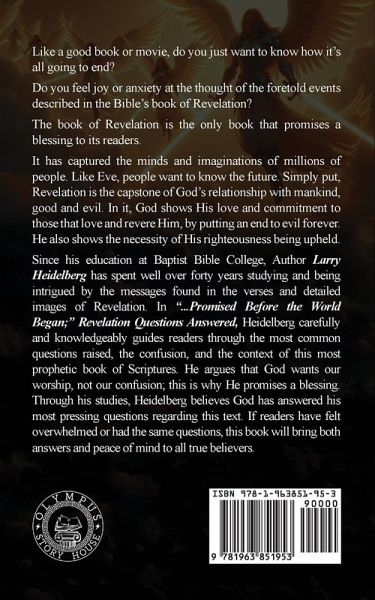 Like a good book or movie, do you just want to know how it's all going to end? Do you feel joy or anxiety at the thought of the foretold events described in the Bible's book of Revelation? The book of Revelation is the only book that promises a blessing to its readers. It has captured the minds and imaginations of millions of people. Like Eve, people want to know the future. Simply put, Revelation is the capstone of God's relationship with mankind, good and evil. In it, God shows His love and commitment to those that love and revere Him, by putting an end to evil forever. He also shows the necessity of His righteousness being upheld. Since his education at Baptist Bible College, Author Larry Heidelberg has spent well over forty years studying and being intrigued by the messages found in the verses and detailed images of Revelation. In "...Promised Before the World Began: Revelation Questions Answered...", Heidelberg carefully and knowledgeably guides readers through the most common questions raised, the confusion, and the context of this most prophetic book of Scriptures. He argues that God wants our worship, not our confusion; this is why He promises a blessing. Through his studies, Heidelberg believes God has answered his most pressing questions regarding this text. If readers have felt overwhelmed or had the same questions, this book will bring both answers and peace of mind to all true believers.
